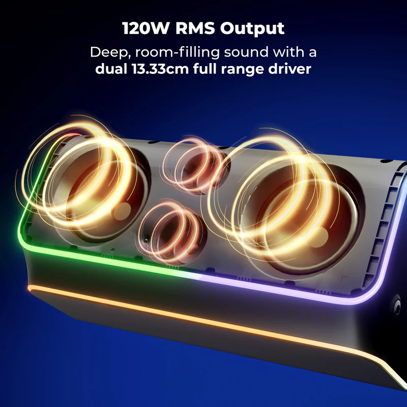 Equipped with dual 13.33cm full-range drivers, the speaker delivers a commanding 120W RMS output, producing deep bass, crisp highs, and room-filling sound. With dedicated Volume, Bass, and Treble controls, users can fine-tune the audio to suit every mood and genre.