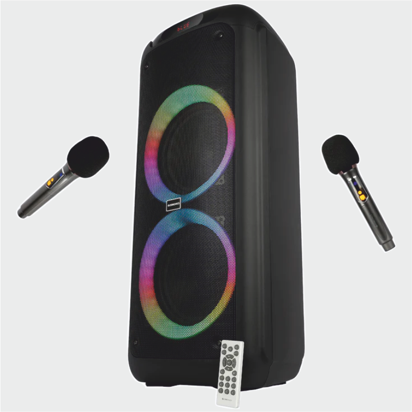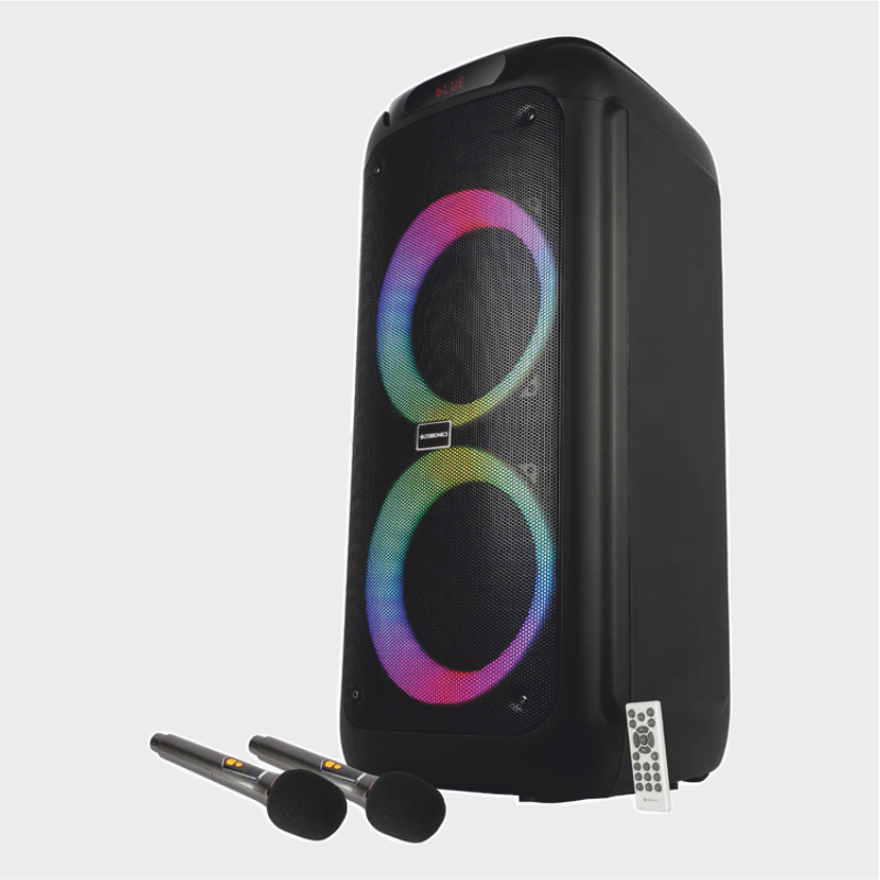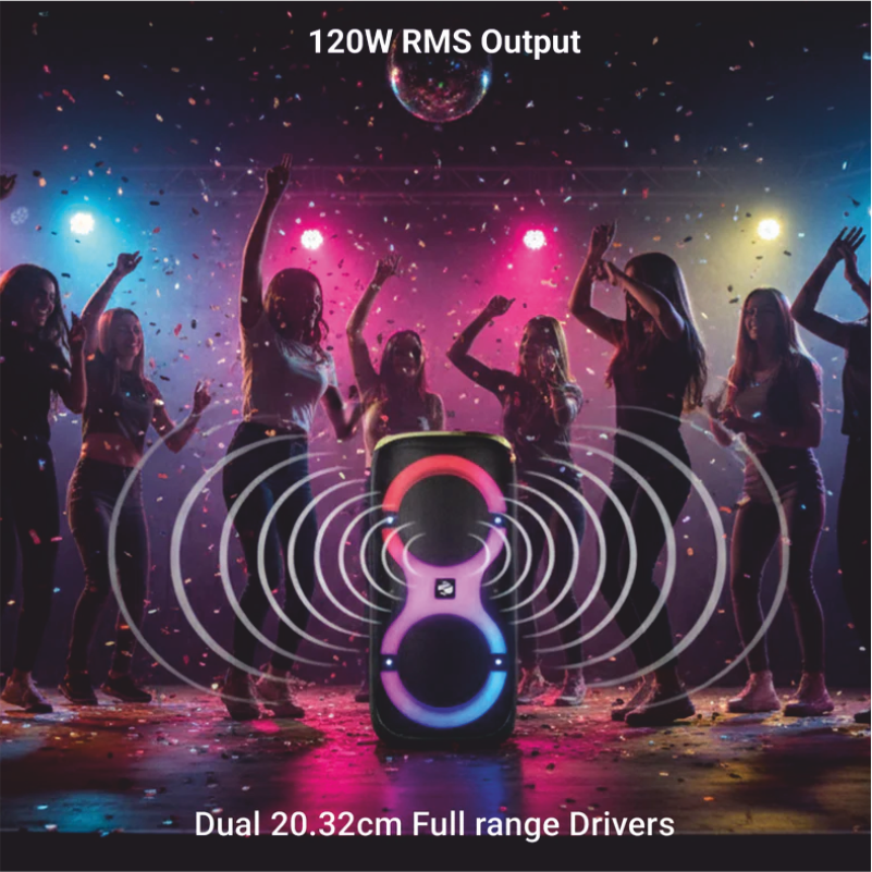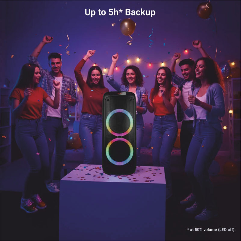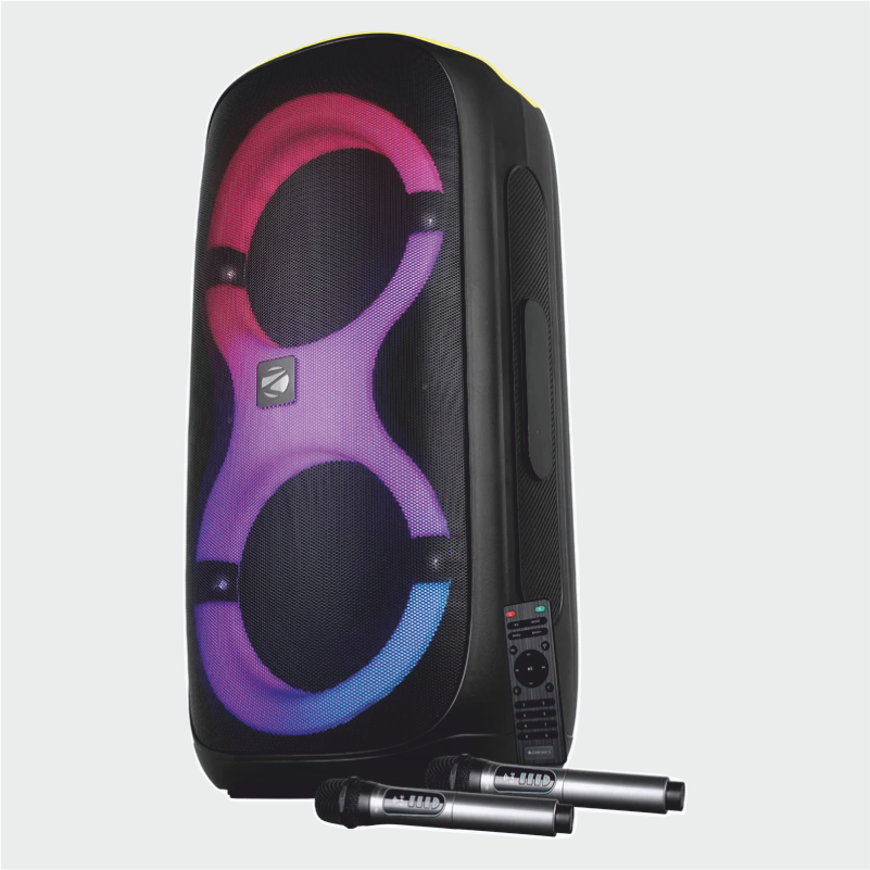 The Zeb-Thump 802 delivers an output of 120 W RMS supported by dual 20.32 cm full range drivers and a tweeter, giving a satisfying bass-to-treble coverage. It also has 3 EQ modes that can be used according to the vibe needed. The top deck is an instant eye-catcher with the neon green panel; whilst the RGB lights complete the party speaker outfit. This party speaker offers multiple connectivity options: Bluetooth v5.3, micro-SD, AUX, FM radio and ports for two 6.3mm wired mics as well and comes with 2 rechargeable wireless mics that are karaoke ready, anywhere, anytime.